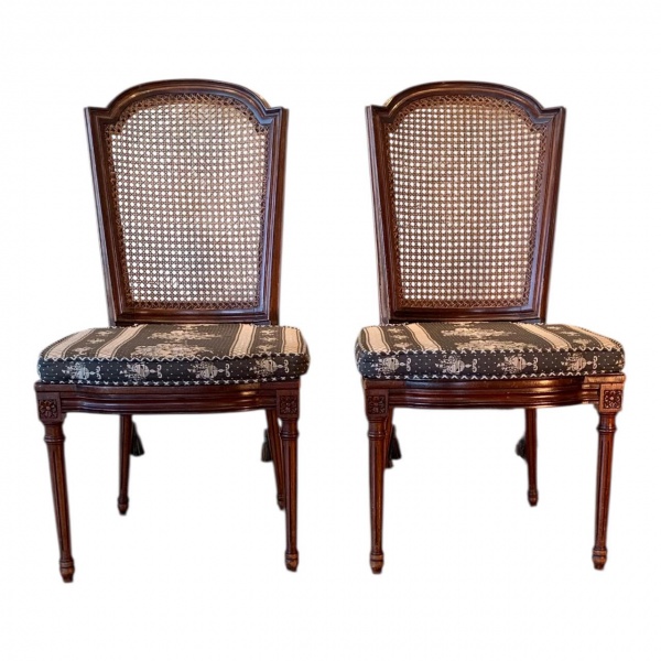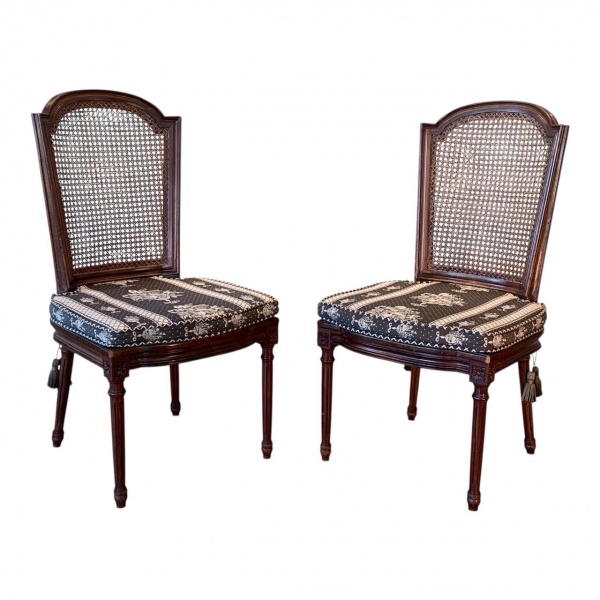 • Par de cadeiras estilo Luís XVI em madeira nobre escurecida, manufatura não identificada, meados do século XX. Estrutura em madeira nobre escurecida, com encosto emoldurado em formato reto com coroa superior em semi-círculo de degrau duplo, característico do estilo Luís XVI.Encosto em palhinha indiana natural, original e bem tensionada.Assento solto, forrado em tecido sintético com padronagem clássica em preto e bege, simulando trama de palha natural.As pernas são retas e caneladas, unidas por travessas discretas, apresentando rosetas florais esculpidas nos cantos dos apoios frontais  detalhe distintivo da linguagem neoclássica francesa.Medidas: 100 cm de altura x 53 cm de largura x 55 cm de profundidade.Em bom estado geral de conservação, sem indícios de restauro, colagens, rachaduras ou partes substituídas.Necessitam apenas de leve lustro de realce para devolver brilho à madeira. Faz conjunto com os dois lotes anteriores.