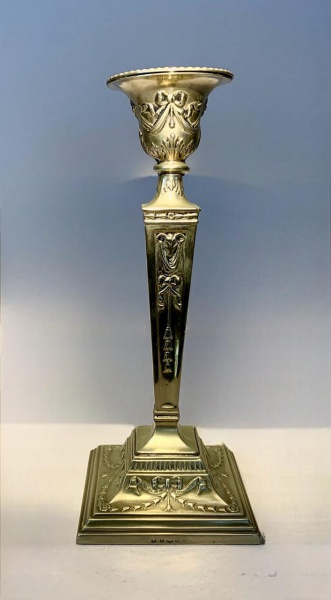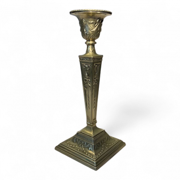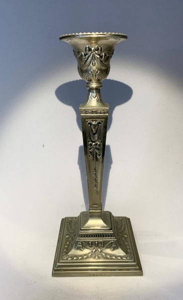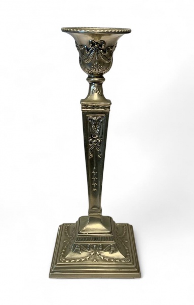 • PRATA INGLESA Castiçal estilo Neoclássico Georgiano, confeccionado em prata de lei marcada (punções parciais desgastadas, possivelmente Sheffield, teor 925), decorado em toda a superfície com guirlandas, laços e acantos em relevo. Corpo em peça única de fuste quadrangular afilado, base moldurada e campânula com borda perlada.Medidas: 31 cm de altura; base 12,5  12,5 cm.Peso bruto: 958 gramas.Estado: excelente, leve patina do tempo. 1/4