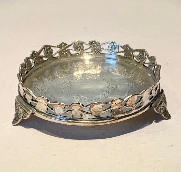 • PRATA DE LEIPequena salva tripoide em prata de lei (teor verificado superior a 800), corpo circular com decoração rendilhada e fundo gravado com guirlanda floral central. Bordas recortadas com flores alternadas e três pés triangulares ornados com flor-de-lis.Medidas: diâmetro 10,5 cm  altura 3 cm.Peso bruto: 120 gramas. Estado: muito bom, leve pátina do tempo e discretas marcas de uso.