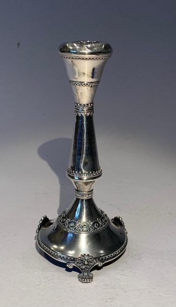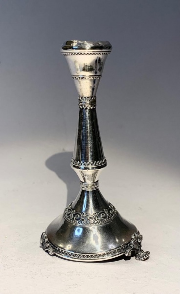 • PRATA DE LEI. Pequeno castiçal tripoide em prata de lei marcado corpo cônico com frisos de perolado e rocalhas em relevo. Base abaulada originalmente com três pés floronados e ornamentação em espiral, de execução manual. Medidas: 13,2 cm de altura  6,5 cm de diâmetro da base. Peso bruto: 58 gramas. Estado: presença de amassados; falta um dos três pés.Observação: exemplar integrante de par de castiçais para oratório doméstico, modelo idêntico ao Lote anterior. * Nota do editor: Observação: modelo de pequeno porte, possivelmente concebido para uso em oratório doméstico ou altar particular, com acabamento esmerado e proporções harmônicas típicas das pratas devocionais de meados do século XX.