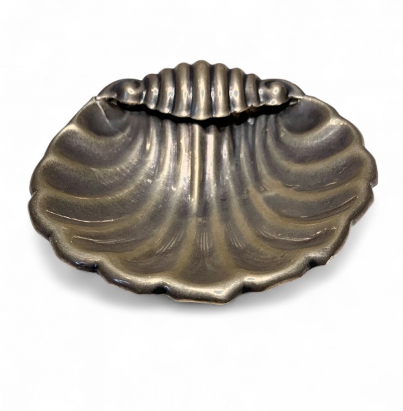 • PRATA DE LEIPequena salva em prata de lei, formato de concha do mar, apoiada sobre três pés em esferas lisas.Peça de gracioso efeito decorativo, utilizada originalmente como apoio para joias, anéis ou doces finos.Medidas: 6  6  2 cm de altura.Peso: 20 gr.