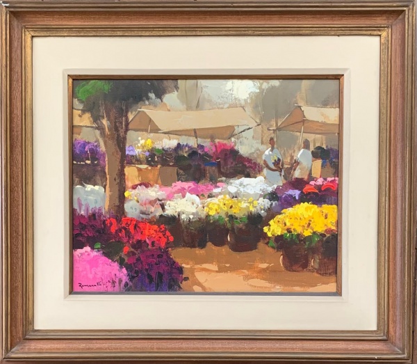 • ARMANDO ROMANELLI (Rio de Janeiro, 1945).Feira de Flores, 1994.Óleo sobre tela.Assinado no canto inferior esquerdo e no verso, onde se lê: Feira de Flores / Romanelli / 1994  40 x 50.Medidas da tela: 40  50 cm.Medidas totais (com moldura): 68  77 cm.A obra retrata uma cena urbana recorrente no trabalho do artista, representando uma feira de flores sob luz intensa, marcada pela pincelada firme e pela paleta rica em vermelhos, violetas e amarelos  recursos típicos da fase madura do artista.Romaneli é conhecido por seu domínio da cor e da composição, destacando-se entre os paisagistas e coloristas cariocas da segunda metade do século XX.*Armando Romanelli de Cerqueira (Rio de Janeiro, 20 de janeiro de 1945) é pintor brasileiro considerado parte da geração pós-impressionista carioca.   Filho e neto de artistas plásticos, iniciou sua produção aos 15 anos e formou-se no Instituto de Belas Artes do Rio, tendo professores como Edgar Walter e Oswaldo Teixeira.   Sua obra combina o colorido vibrante e a luminosidade tropical com influência impressionista europeia, além de por vezes toques expressionistas em cenas urbanas.  Fonte: Arrematearte e site do artista.