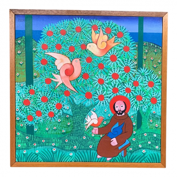 • Adelson do Prado (1944  2013)São Francisco, 1978Óleo sobre tela, 60  60 cm. Medidas totais com moldura: 64,5  64,5 cm.Assinado e datado no canto superior esquerdo Adelson do Prado 78, com título, assinatura e data no verso.Composição de vibrante cromatismo representando São Francisco de Assis em meio à natureza, rodeado por aves  tema caro à iconografia cristã e frequentemente revisitável pelo artista, em que o elemento devocional se alia à celebração da cor e da vida. A pintura revela o estilo inconfundível de Prado: figuras simplificadas, planos bem definidos e cores de alta saturação que remetem à fé popular e à ingenuidade simbólica da arte primitivista.* Nota biográfica: Adelson Filadelfo do Prado nasceu em Vitória da Conquista, BA, em 1944, e faleceu em 2013. Autodidata, iniciou-se na pintura ainda menino, desenhando santos e igrejas de sua cidade natal. Em 1960 já participava da 1ª Convenção de Artistas Locais e, em 1977, realizou um painel no Salão Nobre do Estádio do Maracanã (RJ). Sua obra  marcada por cores intensas e temática religiosa ou cotidiana  destaca-se no panorama da arte naïf brasileira, sendo conhecida pela harmonia entre o sagrado e o popular.