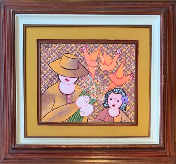 • Adelson do Prado (Rio de Janeiro, 1940  2004)Vendedor de Flores, 1994. Óleo sobre tela, 38  46 cm. Medidas totais com moldura: 79  87 cm.Assinada no canto superior esquerdo e no verso, datada e titulada.Obra de cores vivas e composição geométrica, típica da fase madura do artista, em que figuras femininas e cenas de delicadeza cotidiana são retratadas com linhas simples e simbologia ingênua. O padrão ornamental ao fundo e os pássaros laranja em voo equilibram a paleta quente, característica do lirismo figurativo de Adelson.Adelson do Prado (Rio de Janeiro, 1940  2004) foi pintor autodidata, vinculado ao movimento de arte naïf brasileira. Desenvolveu um estilo imediatamente reconhecível pela pureza cromática, temas religiosos e cenas rurais. Expôs individualmente e em coletivas no Brasil e no exterior, figurando em acervos como o do Museu Internacional de Arte Naïf (MIAN-RJ) e em diversas coleções particulares.