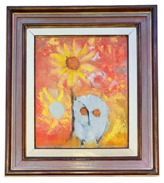 • José de Dome (Estância SE em 1921 e falecido em Cabo Frio (RJ) em 1982). Girassol e Coruja, 1969Óleo sobre telaAssinada e datada no canto inferior direito: José de Dome / Cabo Frio, 2-2-69Verso com inscrição de punho do artista, repetindo o título e local/data.Medidas da tela: 55 x 46 cmMedidas totais (com moldura): 82 x 73 cmA obra revela a fase madura de José de Dome, conhecida pela vibração cromática e espiritualidade simbólica. O artista utiliza o amarelo e o laranja  cores que ele mesmo definia como tons de iluminação interior  para representar uma cena alegórica em que a coruja, figura recorrente em sua iconografia, surge como emblema de sabedoria e silêncio diante da energia solar dos girassóis. O tratamento matérico da superfície e a pincelada expressiva reforçam a dimensão mística do conjunto, marcando a síntese entre forma e cor típica do expressionismo lírico de Dome.* Nota sobre o artista. José de Dome foi um pintor sergipano renomado, nascido em Estância em 1921 e falecido em Cabo Frio (RJ) em 1982. Conhecido por sua arte direta e expressiva, capturou a paisagem urbana de Salvador, além de crianças, animais e cenas do cotidiano. Antes de se dedicar à pintura, teve uma vida de trabalhos manuais e avulsos, migrando para Salvador após a morte da mãe em 1939. Sua carreira deslanchou com exposições em Salvador e depois no Rio de Janeiro, consolidando-se internacionalmente com mais de cem exposições no Brasil e no exterior.