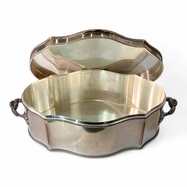 • METAL PRATEADO INGLÊS - Grande caixa em formato oblongo-ondulada em metal prateado, com tampa articulada e alças laterais.Caixa de mesa ou aparador, formato oblongo de bordas sinuosas, decorada com frisos torcidos no contorno da tampa e da base. Pegas laterais em volutas e folhagens. Interior liso, tampa articulada (necessita solda).Apresenta desgaste acentuado na parte superior. Os flancos e parte posterior, anterior e interior da peça estão em bom estado geral de conservação.Marcas de fabricante gravadas na base: DF Y S 3624 D, correspondendo a manufatura inglesa de metal prateado (silver plate), possivelmente Deepe & Sons, século XX.Dimensões: 42 cm x 35 cm x 13 cm de altura.