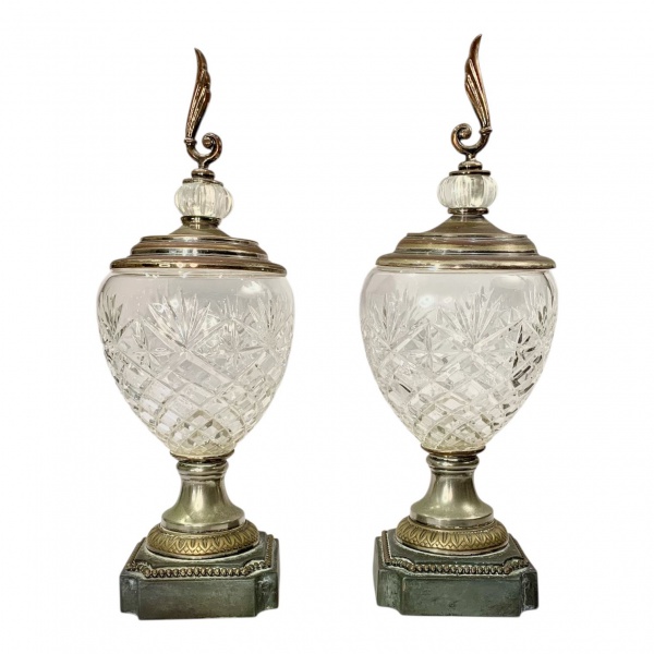 • METAL PRATEADO /  ESTANHO E CRISTAL - Par de potiches em metal prateado, estanho e cristal moldadoEuropa, circa 1920/40.Conjunto formado por duas urnas decorativas de corpo ovóide em cristal moldado e lapidado em padrão de losangos e estrelas, montadas sobre bases quadradas escalonadas em liga de estanho e chumbo, com frisos perolados e guarnições douradas. Tampas em metal prateado, encimadas por pináculos em forma de chama estilizada e esferas de cristal facetado. Peças de refinado trabalho artesanal, evocando o gosto neoclássico revival típico da Belle Époque.Presença de sinais do tempo e oxidação nas bases.Medidas: 43 cm de altura; base 12 x 12 cm.HISTÓRIA - Urnas com tampa, muitas vezes chamadas de vasos ou jarras, têm uma longa história em artes decorativas, servindo a fins funcionais e estéticos.Historicamente, eles eram usados para armazenar itens preciosos ligados a práticas funerárias ou como peças ornamentais em grandes casas. A combinação de vidro cortado e metalurgia tornou-se particularmente popular durante o século XIX e início do século XX, refletindo avanços na fabricação de vidro e técnicas de fundição de metal. Necessitam restauração. Leve bicado na borda de uma das taças de cristal (vide foto complementar).